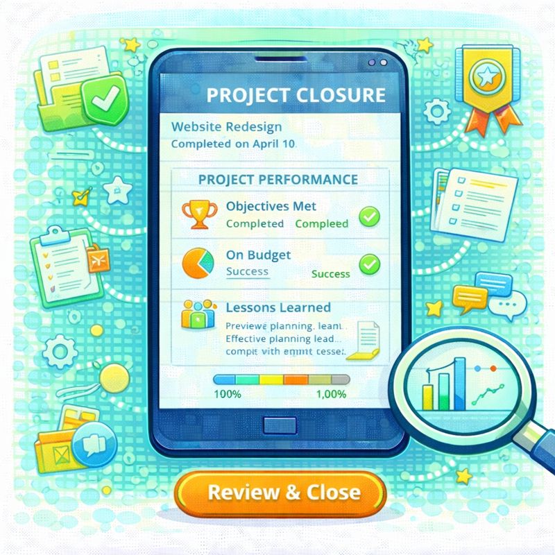 Close projects formally and review performance to capture outcomes, learnings, and results.