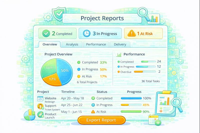 Generate clear project reports to analyze progress, performance, and delivery outcomes.