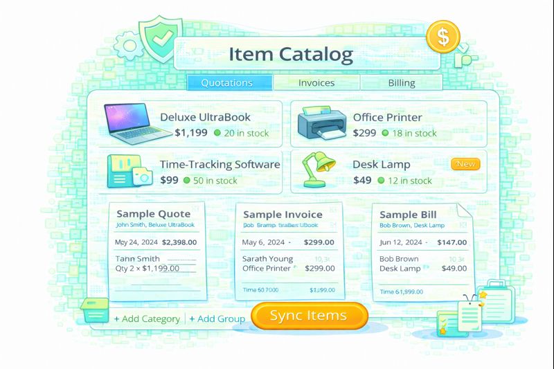 Use a single item catalog across quotations, invoices, and billing for consistent sales operations.